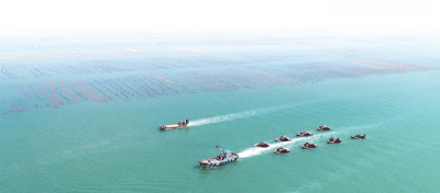 在山東省榮成市愛倫灣海域,養殖工人駕駛滿載江蘺的舢板駛向碼頭。