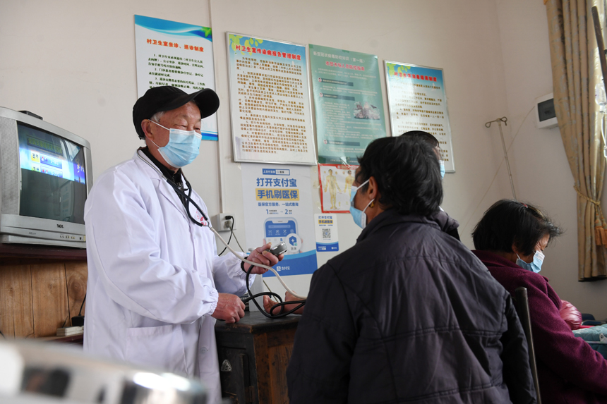 村醫徐秋生在為村民檢查身體。周亮攝
