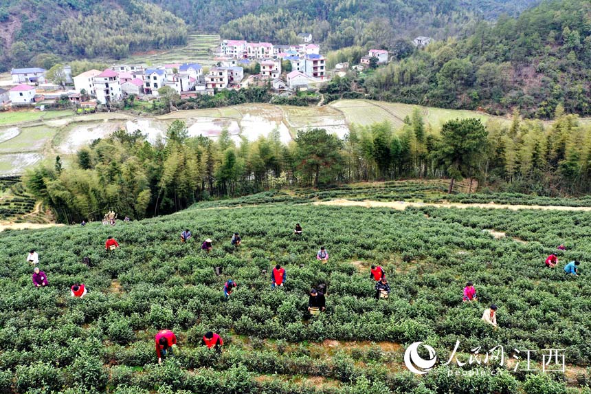 陽春三月,茶樹吐翠。走在贛鄱大地贛東北、贛中南等優勢茶區,一壟壟茶樹,匯聚成一道道綠浪,從空中俯視,宛如大地指紋。身處其間,鼻息間盡是淡淡的茶香,沁人心脾。和美景相映成襯的是三五成群的茶農,靈巧的指尖上下翻飛,一片又一片芽條輕輕落在斜挎在腰間的小竹簍里。