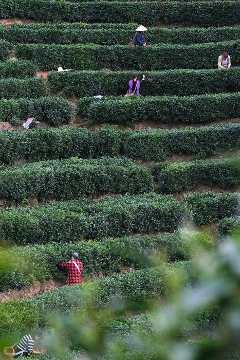 極目遠眺,只見巍巍群山,層巒疊嶂,連綿起伏。俯瞰身前,一壟壟茶樹,匯聚成一道道綠浪,在山谷、山脊或山坳間涌動。置身其中,鼻息間盡是淡淡的茶香,沁人心脾。