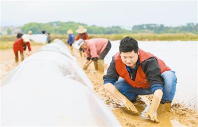 圖為3月28日,樟山鎮陂上村,共產黨員服務隊正在幫助農民搭建秧棚。