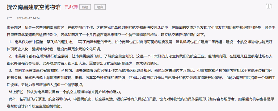 “南昌作為新中國第一架飛機的誕生地,書寫了南昌制造的榮光。建設一個航空博物館也能更好體現歷史文化,強調地域特色,建設南昌更多元的文化環境!苯,網友通過人民網“領導留言板”給南昌市市長建言,提議南昌建設航空博物館。