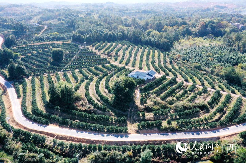 江西信豐縣的一處臍橙園。臍橙成為當地農民致富的“黃金果”。 人民網 時雨攝