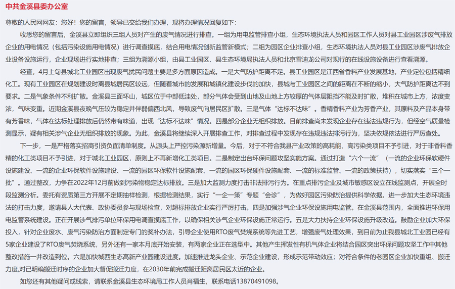 收到網友留言后,金溪縣立即組織三組人員對產生的廢氣情況進行排查。經查,4月上旬縣城北工業園區出現廢氣擾民問題主要是多方面原因造成。