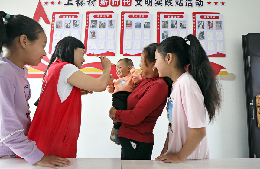 志愿者在宜豐縣天寶鄉上梅村新時代文明實踐站給孩子們額上點雄黃。何賤來攝