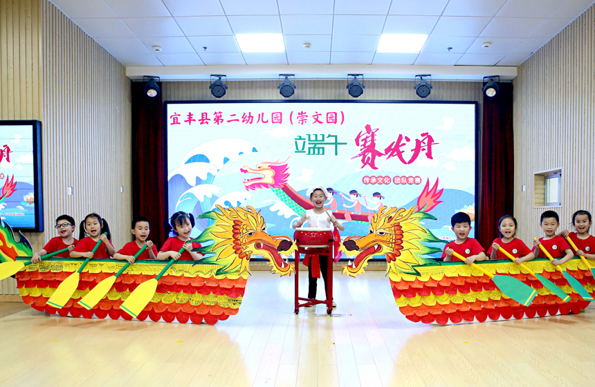 宜豐縣第二幼兒園(崇文園)小朋友體驗劃“龍舟”樂趣。何賤來攝