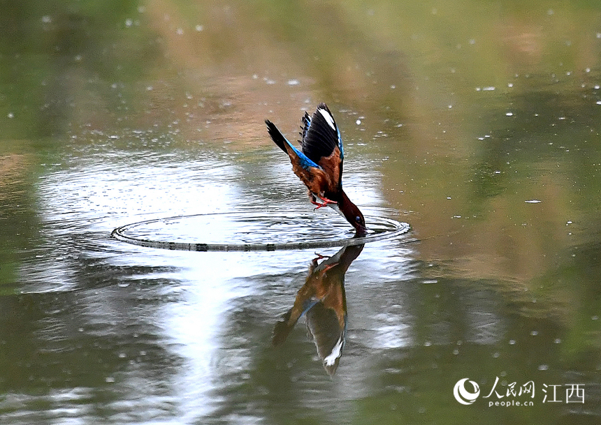 白胸翡翠從空中俯沖而下捕捉小魚。 人民網 時雨攝