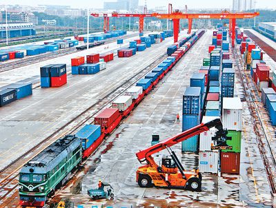 截至今年4月,江西贛州國際陸港日吞吐量已達600標箱,中歐(亞)班列覆蓋中亞五國及歐洲20多個國家100多個城市。圖為日前,贛州國際陸港內,一列貨運班列到站,大型龍門吊正在吊裝集裝箱,貨車來來往往,一派繁忙景象。