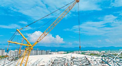 6月10日,江西省贛州市全民健身中心項目建設工地,施工方正在高空架設主場館外圍和頂棚鋼架。