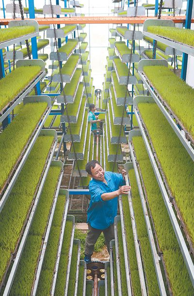 江西省吉安市吉水縣醪橋鎮黃泥洞農業科技智能化育秧工廠,農技人員在查看早稻秧苗生長情況。農技人員下沉一線,加強技術指導服務,為加快農業農村現代化貢獻力量。