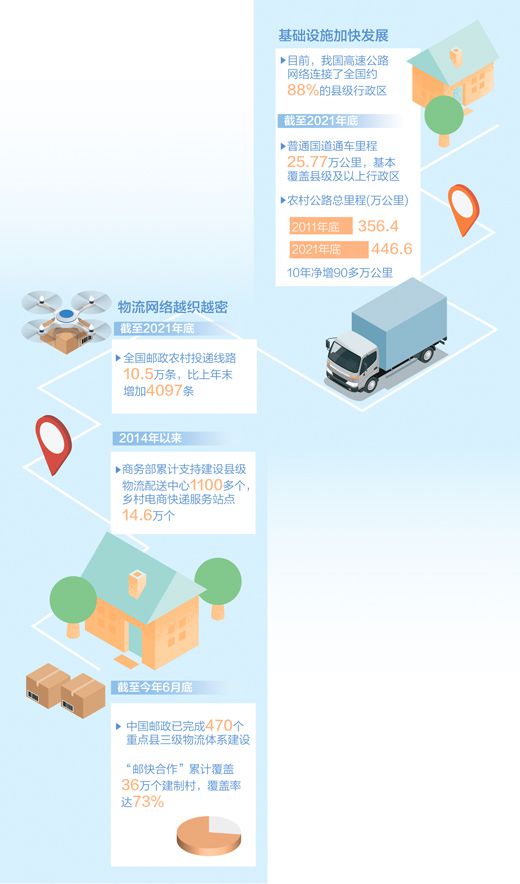 近年來,我國“通道+樞紐+網絡”物流運行體系建設持續推進,重大物流基礎設施加快建設,國家骨干流通網絡逐步健全。日前發布的《2021年郵政行業發展統計公報》指出,全國郵政農村投遞線路10.5萬條,比上年末增加4097條;農村投遞路線長度(單程)415.5萬公里,比上年末增加5.1萬公里。