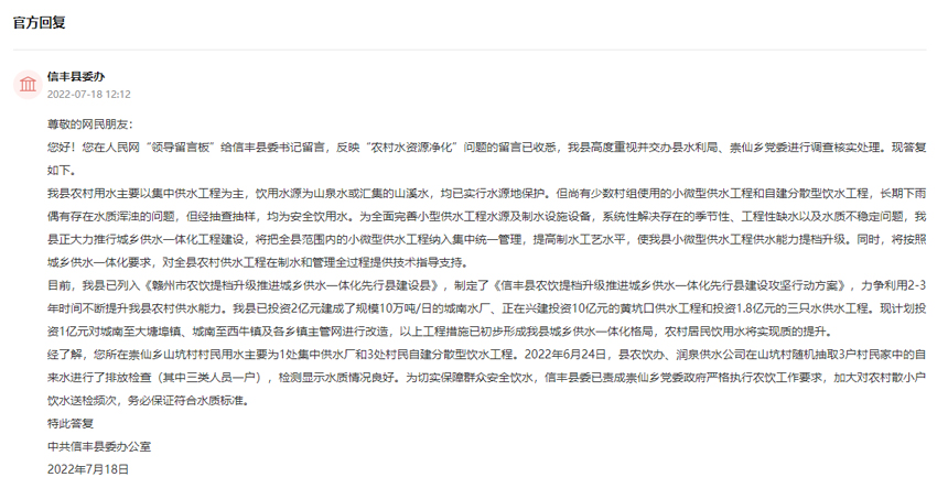 收到網友反映“農村水資源凈化”問題的留言后,信豐縣高度重視并交辦縣水利局、崇仙鄉黨委進行調查核實處理。