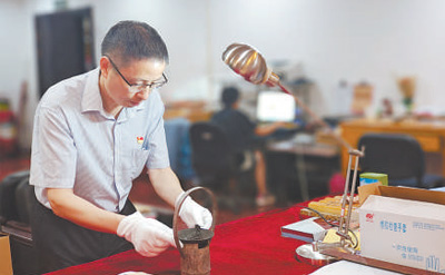 饒道良在觀察研究館藏文物。井岡山革命博物館供圖
