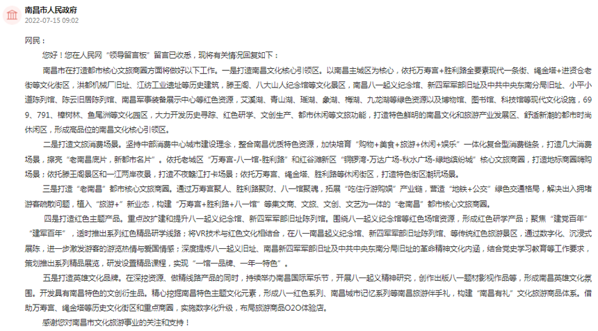 收到網友留言后,南昌市人民政府回復稱,南昌市在打造都市核心文旅商圈方面將做好五方面工作。