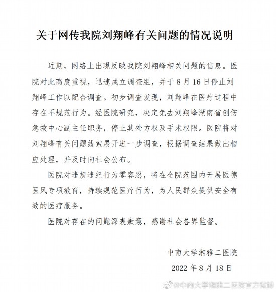 8月18日,中南大學湘雅二醫院發布情況說明稱:初步調查發現,劉翔峰在醫療過程中存在不規范行為。經醫院研究,決定免去劉翔峰湖南省創傷急救中心副主任職務,停止其處方權及手術權限。