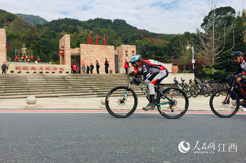依托紅色資源,江西省銅鼓縣舉行山地自行車賽。圖為2019年11月,山地自行車賽選手駛過秋收起義紀念地。人民網 時雨攝