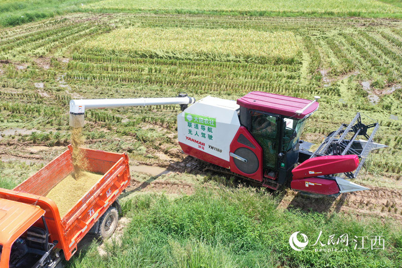 在南昌縣蔣巷鎮,無人駕駛收割機正在稻田收割早稻。人民網 時雨攝