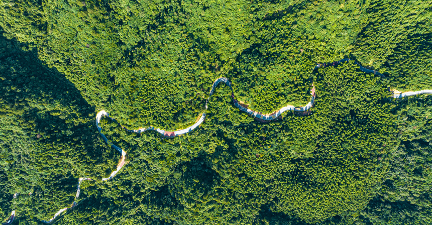在崇山峻嶺中,條條公路似玉帶纏繞在青山綠水之間。尹文兵攝