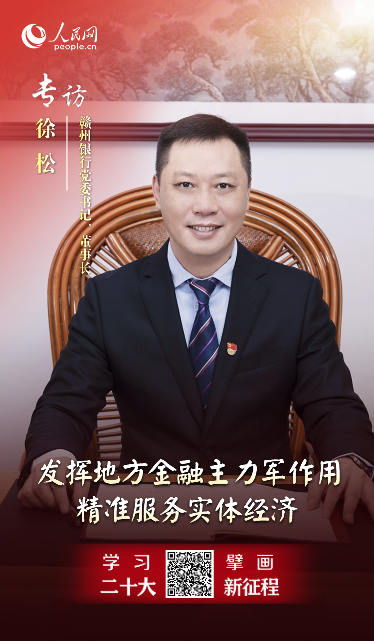 當前,全國金融系統正在全面系統地學習宣傳貫徹黨的二十大精神,守正創新,踔厲奮發,全面助推地方經濟高質量發展。近日,贛州銀行黨委書記、董事長徐松接受人民網專訪,介紹贛州銀行如何精心組織“學”,廣泛深入“講”,結合實際“干”,推動黨的二十大精神落實到發展的各方面,以踔厲奮發勇毅前行姿態奮進新征程。以下為訪談實錄: