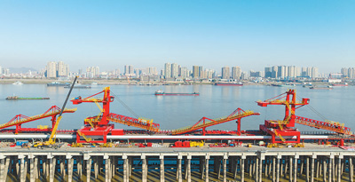位于江西省瑞昌市的長江金絲港碼頭項目新建5個5000噸級泊位,設計年吞吐量達3320萬噸。項目將建成高效、節能、環保的現代綠色智慧碼頭,成為通江達海的水陸聯運口岸,助力當地經濟社會高質量發展。圖為12月18日,長江金絲港碼頭建設工地正在進行設備安裝作業。