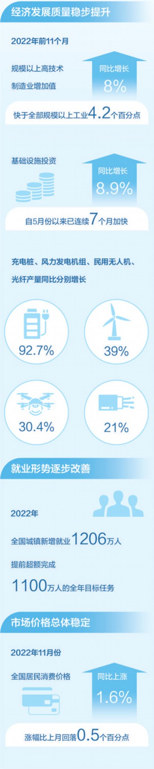 2022年,面對風高浪急的國際環境和艱巨繁重的國內改革發展穩定任務,我國經濟穩健發展,全年國內生產總值預計超過120萬億元??垂┙o結構,產業升級發展持續,新動能積蓄增強。2022年前11個月,規模以上高技術制造業增加值同比增長8%,快于全部規模以上工業4.2個百分點;看消費需求,線上消費需求釋放帶動作用明顯。前11個月,全國實物商品網上零售額同比增長6.4%,網絡購物帶動快遞等行業較快增長。
