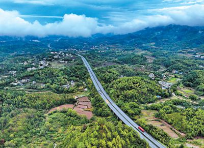 在江西省贛州市濟廣高速瑞金至尋烏路段,大貨車馳騁在公路上,帶動物流寄遞行業快速發展。朱海鵬攝(人民視覺)
