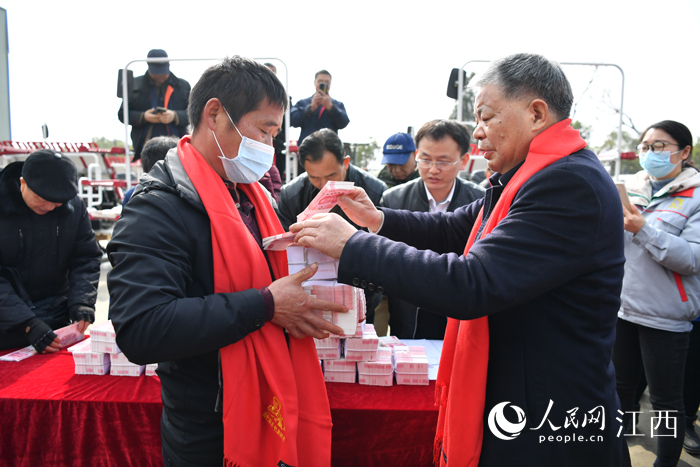 江西南昌安義縣鼎湖鎮種糧大戶凌繼河給農戶發放年終獎。人民網時雨攝