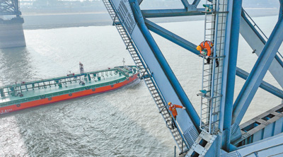 近日,中國鐵路南昌局九江橋工段職工正在檢修九江長江大橋上的航標燈,為春運安全暢通保駕護航。