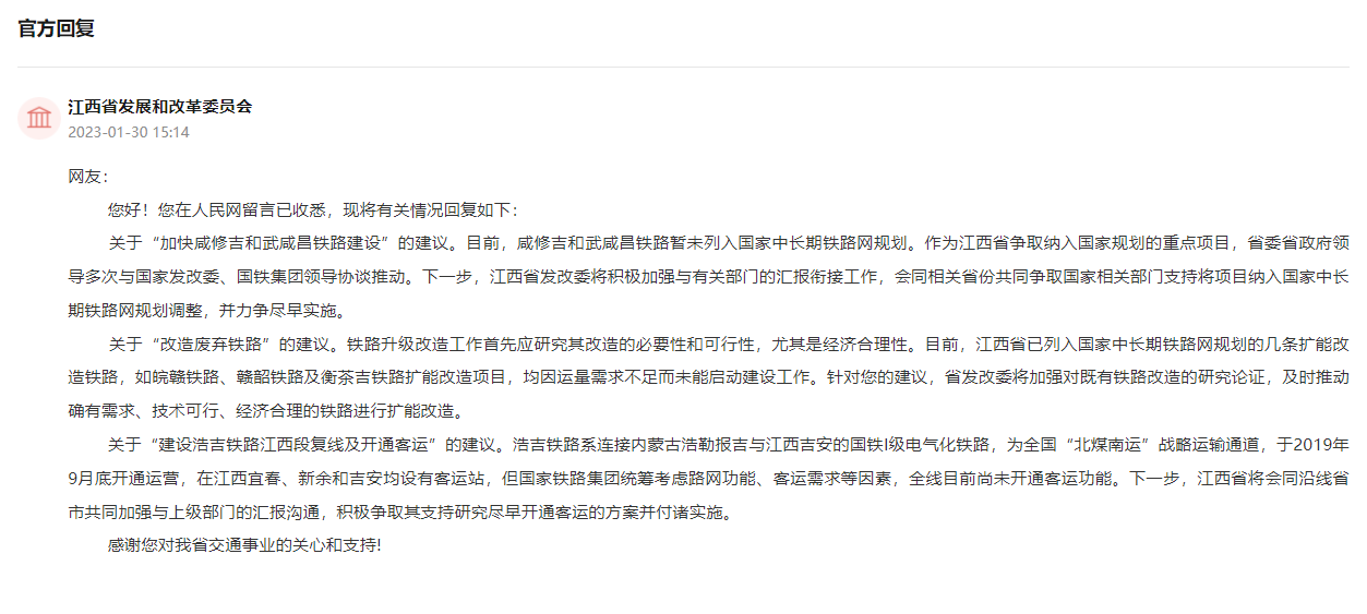 人民建議 | 網友對江西省鐵路建設的三條建議獲官方回復