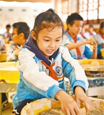 江西省樟樹市臨江鎮中心小學,學生體驗陶瓷拉坯。