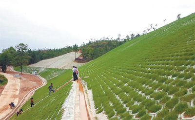 興國縣鼎龍鄉湖溪村瑤下公路旁邊大型崩崗,通過削坡后鋪墊六棱塊和草皮護坡,水土保持效果良好。