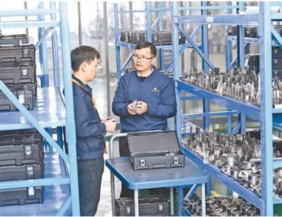 全國勞動模范、江西省贛州澳克泰工具技術有限公司研發工程師邱聯昌(右)在車間檢測模具。邱聯昌長期從事硬質合金耐磨涂層研發工作,為當地稀土鎢新材料產業發展作出了積極貢獻。 劉 青攝(人民視覺)