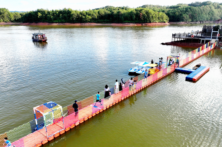 煙波浩渺五渡港,人間仙境桃花源。極具特色的彩虹浮橋、古色古香的小木屋、清爽刺激的沖鋒艇……5月16日,走進江西省信豐縣萬隆鄉石店村五渡港水庫,映入眼簾的是一幅風景秀麗、風光旖旎的美景圖,小舟緩緩前行,浮橋輕輕晃動,陽光打在沙灘上,大量游客前來打卡游玩。