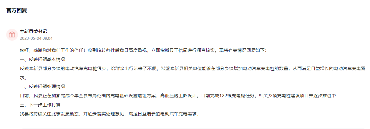 針對網友反映問題,奉新縣在回復中表示,目前,正在加緊完成今年全縣布局范圍內充電基礎設施選址方案、高低壓施工圖設計。目前完成122根充電槍任務。相關鄉鎮充電樁建設項目并逐步推進中。
