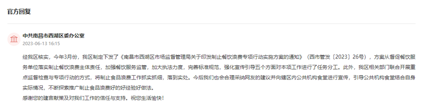 南昌市西湖區委辦公室回復稱,今年3月份,該區已制定下發了《南昌市西湖區市場監督管理局關于印發制止餐飲浪費專項行動實施方案的通知》,方案從督促餐飲服務單位落實制止餐飲浪費主體責任,加強餐飲服務監管,加大執法力度,完善標準規范,強化宣傳引導五個方面對本項工作進行了任務分工。