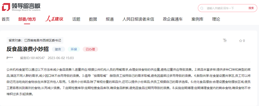 人民建議丨網友為公共機構食堂減少食品浪費支招 南昌西湖區:合理采納建議