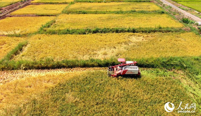 7月14日,江西省贛州市會昌縣小密鄉蓮塘村富硒早稻種植基地,農機手駕駛著收割機在金燦燦的稻田里來回穿梭,加快“雙搶”進度。人民網 朱海鵬攝