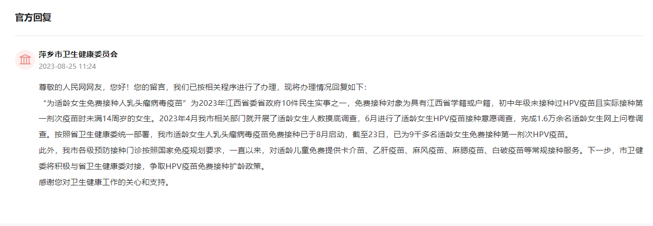 回復中表示,萍鄉市相關部門在2023年4月就開展了適齡女生人數摸底調查,6月進行了適齡女生HPV疫苗接種意愿調查,完成1.6萬余名適齡女生網上問卷調查。按照江西省衛生健康委統一部署,萍鄉市適齡女生人乳頭瘤病毒疫苗免費接種已于8月啟動,截至8月23日,已為9千多名適齡女生免費接種第一劑次HPV疫苗。