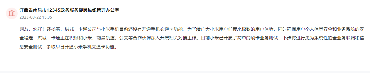 對于群眾反映的問題,經核實,洪城一卡通公司與小米手機目前還沒有開通手機交通卡功能。為了給廣大小米用戶們帶來極致的用戶體驗,同時確保用戶個人信息安全和業務系統的安全穩定,洪城一卡通正在積極和小米、南昌軌道、公交等合作伙伴深入開展相關對接工作。