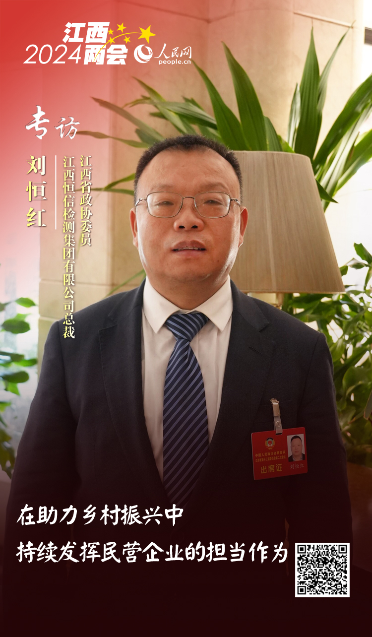 【編者按】2024年江西省兩會召開期間,人民網推出“‘走在前 勇爭先 善作為’|2024江西兩會代表委員系列訪談”節目,聚焦各地如何解放思想、開拓進取,揚長補短、固本興新,努力在加快革命老區高質量發展上走在前、在推動中部地區崛起上勇爭先、在推進長江經濟帶發展上善作為,奮力譜寫中國式現代化江西篇章,圍繞打造“三大高地”、實施“五大戰略”,為江西經濟社會高質量發展作出新的貢獻。江西省政協委員、農工黨江西省委會委員、江西省新聯會副會長、江西恒信檢測集團有限公司總裁劉恒紅接受了我們的專訪,以下為訪談實錄: