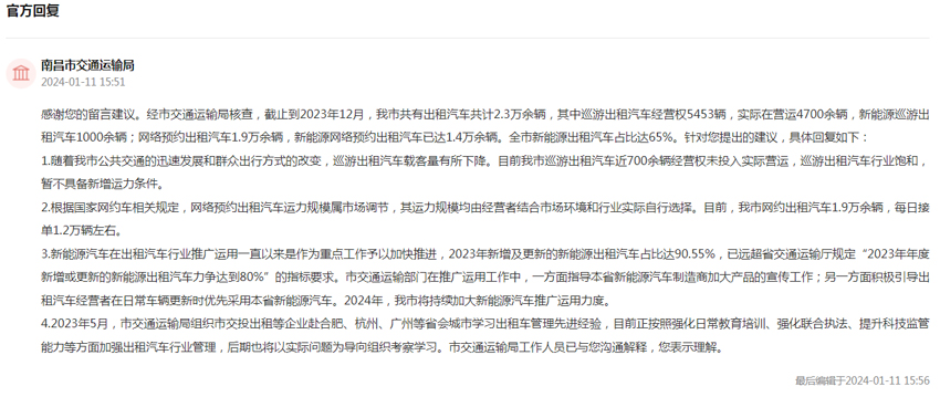 收到網友留言后,南昌市交通運輸局核查回復。截至2023年12月,南昌市共有出租汽車共計2.3萬余輛,其中巡游出租汽車經營權5453輛,實際在營運4700余輛,新能源巡游出租汽車1000余輛;網絡預約出租汽車1.9萬余輛,新能源網絡預約出租汽車已達1.4萬余輛,全市新能源出租汽車占比達65%。