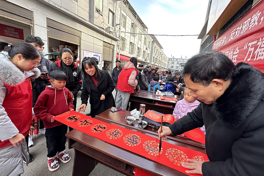 書法家們現場揮毫潑墨為當地村民寫春聯。