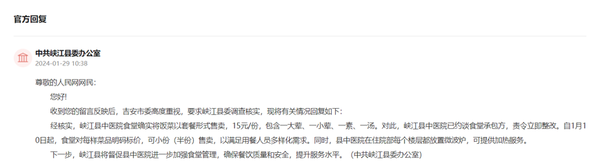 “江西省吉安市峽江縣中醫院食堂盒飯為套餐形式售賣,三個菜和一份米飯,最低價格為每份15元。菜品和主食不單獨售賣,如套餐中有一個菜品不想要,仍需要花費15元?!苯?,網友通過人民網“領導留言板”給江西省吉安市委書記留言,反映醫院食堂飯菜售賣方式不合理。