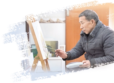 一手托著調色盤,一手舉著畫筆,眼前一個畫架,陳云發常常沉浸在自己的創作中。過去,陳云發以種田和做泥瓦工為生。藝術區建設期間,陳云發家中的幾間房子被張佰橋租來存放畫具。藝術家們創作時,陳云發也在旁邊看。后來,張佰橋送給陳云發一套畫具,“感興趣,就跟著學!”