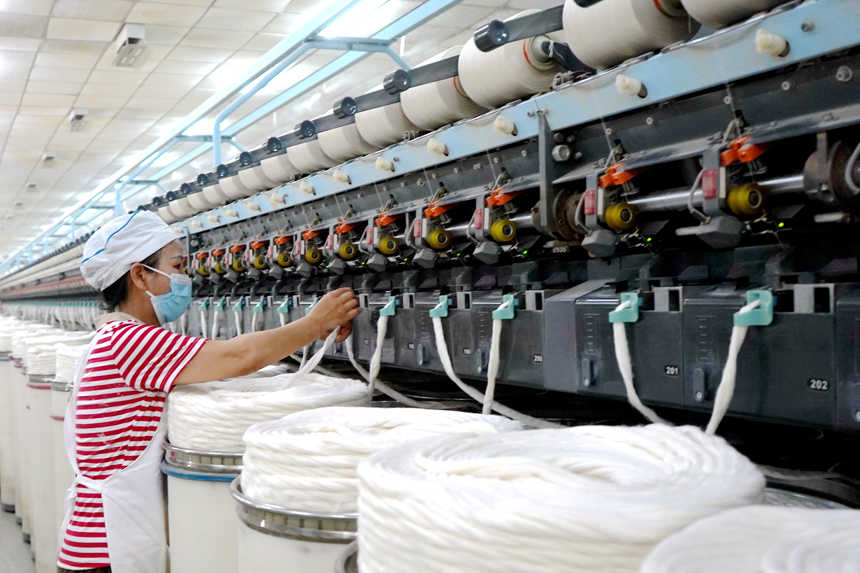 位于江西省宜春市上高縣青陽棉麻紡織有限公司生產車間,工人正在加緊趕制訂單,滿足國內外市場需求。陳旗海攝