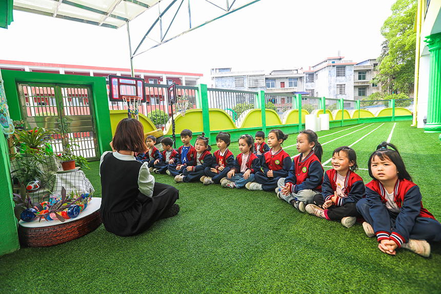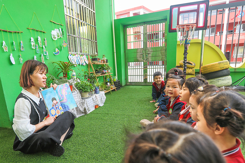 2024年4月18日,在江西省萍鄉市湘東區老關鎮登官村幼兒園,老師正帶領小朋友們一起閱讀繪本。為迎接世界讀書日,湘東區開展“樂享閱讀”活動,培養孩子們愛書、讀書、藏書的習慣,營造全民讀書氛圍。(彭亮攝影報道)