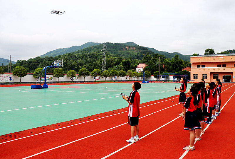 操場上,孩子們在老師的指導下,嫻熟地操縱無人機飛行;