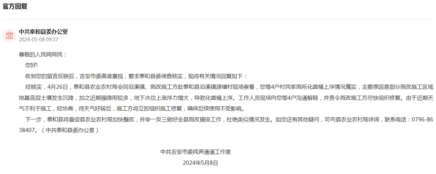 5月16日,記者致電泰和縣農業農村局,該局表示源塘村4戶村民家廁所化糞桶上浮問題已解決,全縣廁改摸排工作也已完成。