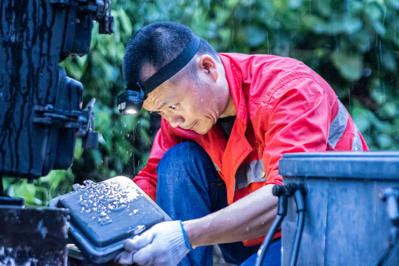 接到搶險命令后,范明華和工友們第一時間抵達現場,冒雨檢查了電力設備狀況后,下午又組織人員安裝搶修照明設備。