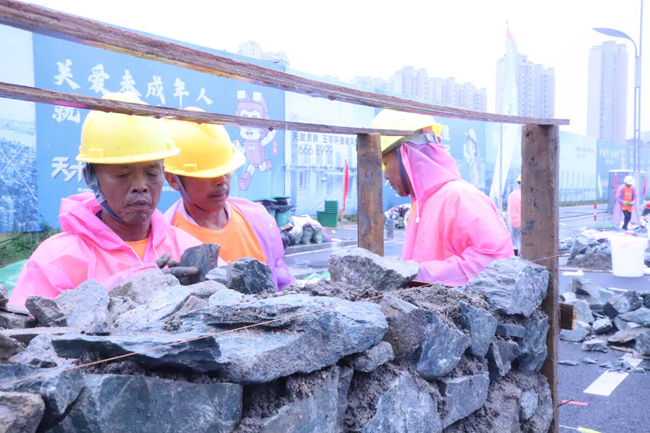 上午10點整,隨著開賽一聲哨響,十幾支砌筑隊伍一字排開,要將一堆片石砌成一堵1米多高的擋土墻。